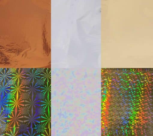 Inhalt: Test-Paket mit 6 Blatt (je 1x pro Farbe). Format: Jedes Blatt misst 32 x 21 cm. Enthaltene Farben: Gold, Silber, Bronze, Interferenz, Gold-Hologramm und Silber-Hologramm. Tipp: Das Mix-Set eignet sich hervorragend, um vor größeren Projekten Farbmuster auf deinem Untergrund zu erstellen.